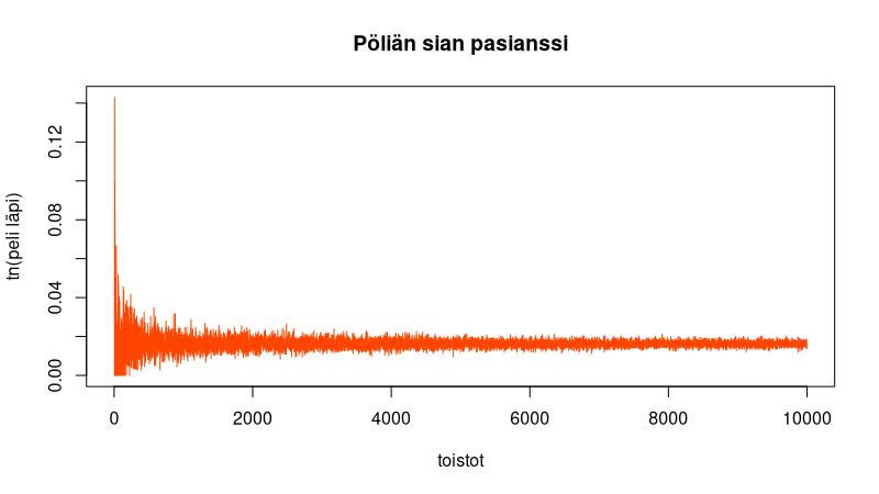 Millä todennäköisyydellä pasianssin saa pelattua loppuun? Koitin laskea tätä analyyttisesti, mutta en keksinyt ratkaisua. Toinen vaihtis on simuloida peliä monte carlolla. Toistetaan peliä vaikka yhdestä kymmeneen tuhanteen kertaan ja lasketaan mikä osuus peleistä menee läpi. Tämän pitäisi konvergoitua melko nopeasti oikeaa tn:ää kohti.